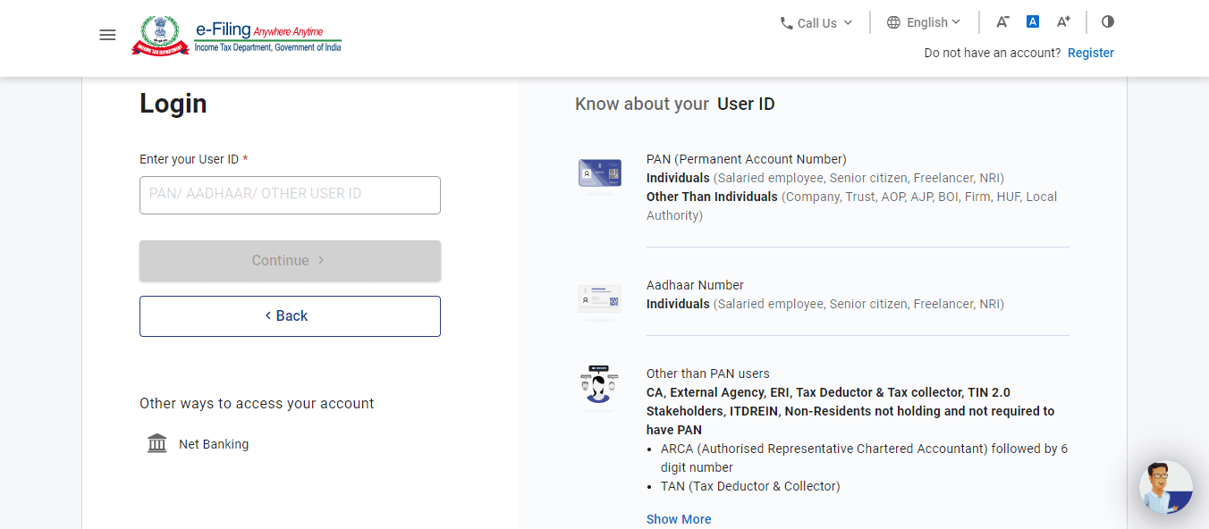 - Once registered, you can log in using your PAN as the user ID and your password.